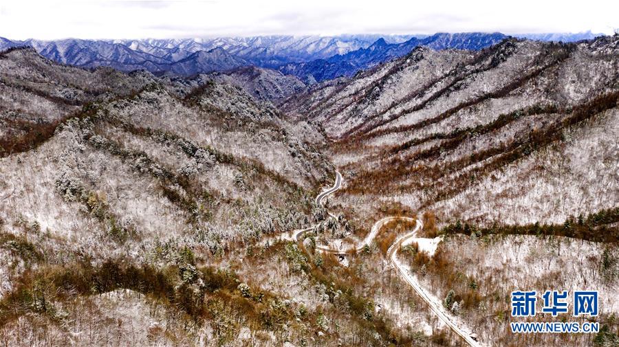 11月5日無人機(jī)拍攝的陜西省漢中市佛坪縣涼風(fēng)埡景區(qū)雪景。 新華社記者陶明攝