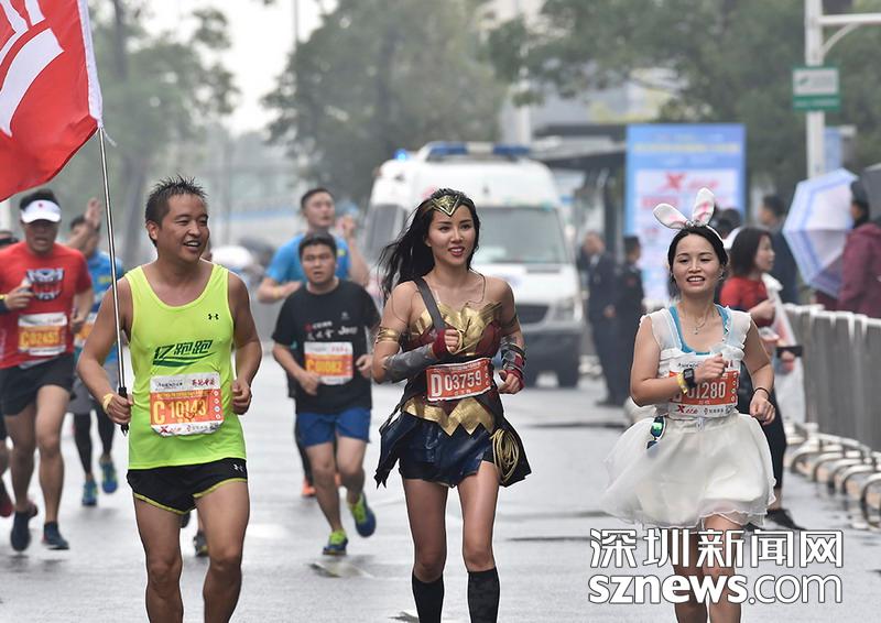 2018年12月16日,深圳國際馬拉松位于后海的折返點,三名選手正向終點狂奔。