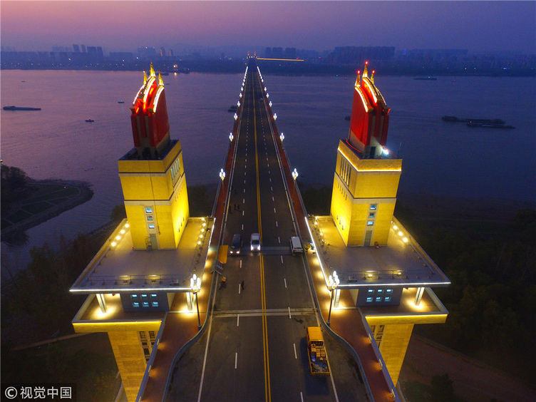 2018年12月13日,江蘇南京,“一橋飛架南北,天塹變通途?!弊鳛槲覈?guó)第一座自行設(shè)計(jì)和建造的雙層鐵路、公路兩用橋,南京長(zhǎng)江大橋在我國(guó)橋梁史上的重要地位不言而喻。從1968年建成后的48年間,它就如同一條巨龍,始終在長(zhǎng)江上默默守護(hù)著人來(lái)車往。南京長(zhǎng)江大橋上層是公路橋,下層為雙軌復(fù)線鐵路橋,連接津浦鐵路與滬寧鐵路干線,是我國(guó)南北交通要津和命脈。近年來(lái),由于南京長(zhǎng)江大橋公路橋的實(shí)際通行荷載遠(yuǎn)超原先設(shè)計(jì)標(biāo)準(zhǔn),不僅橋面上擁堵常現(xiàn),橋梁本身的種種“病害”也日益加深。圖為2018年12月13日,夜幕降臨,南京長(zhǎng)江大橋歸位后的玉蘭花燈重新點(diǎn)亮。大橋玉蘭花燈柱共有299根,每根燈柱上有5盞玉蘭花燈,1大4小,一共1495盞。方東旭/視覺中國(guó)