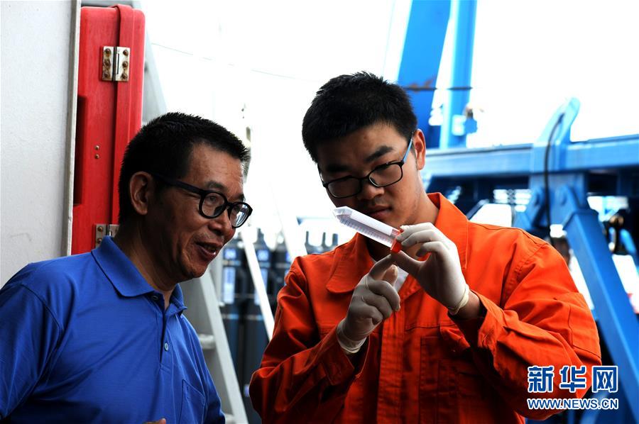 “彩虹魚”科考團隊海上總指揮崔維成(左)和考察隊員耿道(右)在觀察捕獲的深淵生物(12月12日攝)。