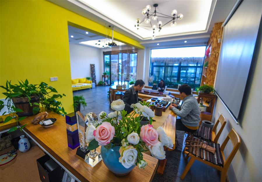 12月15日,客人在朱家尖烏石塘“漁夫客?!泵袼薮髲d喝茶。該民宿有海景房7間,餐飲包廂8個(gè)。 新華社記者 徐昱 攝