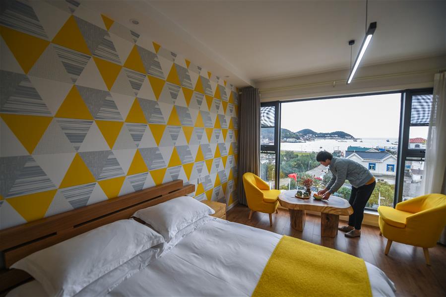 12月15日,工作人員在朱家尖烏石塘“漁夫客?!泵袼蘅头績?nèi)忙碌。 新華社記者 徐昱 攝