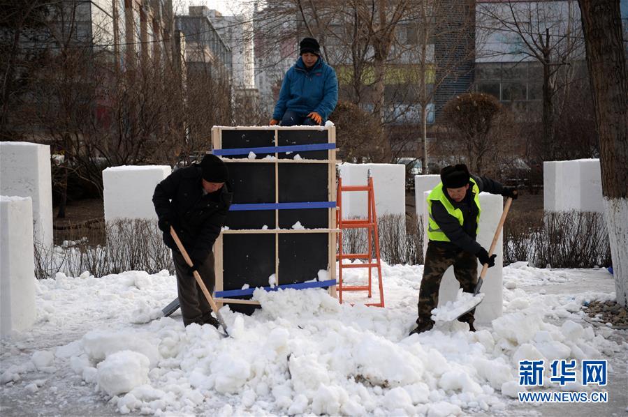12月17日,工人們?cè)谒苫ń鲜占K,準(zhǔn)備制作雪雕作品。新華社記者王凱攝