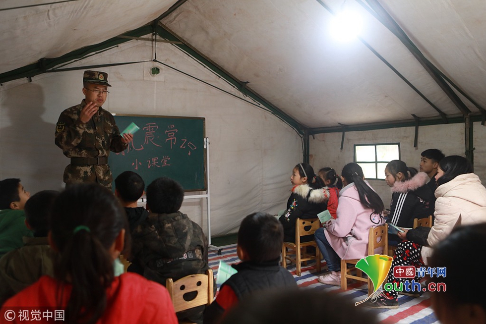 武警宜賓支隊政治工作處宣傳保衛(wèi)股股長朵祝偉為周家鎮(zhèn)新塘安置點的“帳篷學?!钡膶W生上抗震常識課。