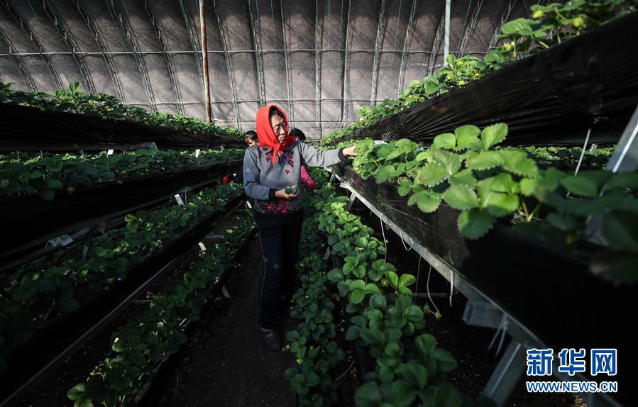 12月19日,農戶在大棚里管理草莓。 2017年5月,遼寧省鐵嶺市昌圖縣大四家子鎮(zhèn)方家船口村利用土地確權成果,由村兩委班子成員領辦創(chuàng)辦了昌圖久晟果木蔬菜種植專業(yè)合作社。到2018年9月,合作社利用產業(yè)扶貧資金、壯大村集體經濟扶持資金、村集體用地和村民入股資金建成了11個“股份制大棚”,主要種植草莓等作物,產品通過電商銷往云南、四川、北京、上海等地,預計第一期可為265名貧困戶每人分紅860元。 新華社記者潘昱龍攝