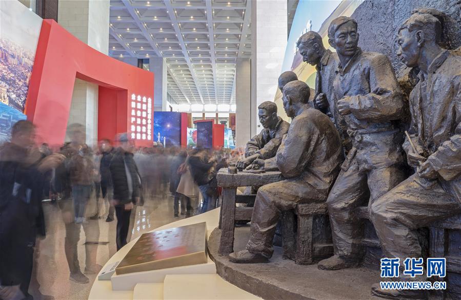 11月18日,觀眾在觀看安徽小崗村農(nóng)民按下包產(chǎn)到戶“紅手印”的雕塑(慢門拍攝)。新華社記者 才揚 攝