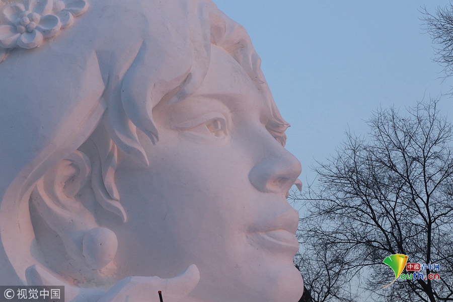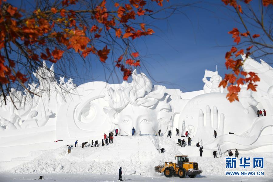 2018年12月13日,黑龍江省哈爾濱市,國內(nèi)最大的雪雕盛會太陽島雪博會正在緊鑼密鼓建設中,部分雪雕雛形已現(xiàn),雪雕師正在精雕細刻打磨中。