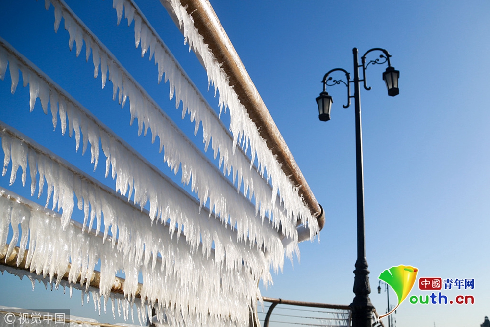 渤海海水在北風(fēng)的作用下涌向岸邊,在大連東港海岸護(hù)欄上凝結(jié)成冰凌,形成約有兩公里的冰凌奇觀。圖為大連市東港海岸護(hù)欄結(jié)滿晶瑩剔透的冰棱。圖片來源:視覺中國