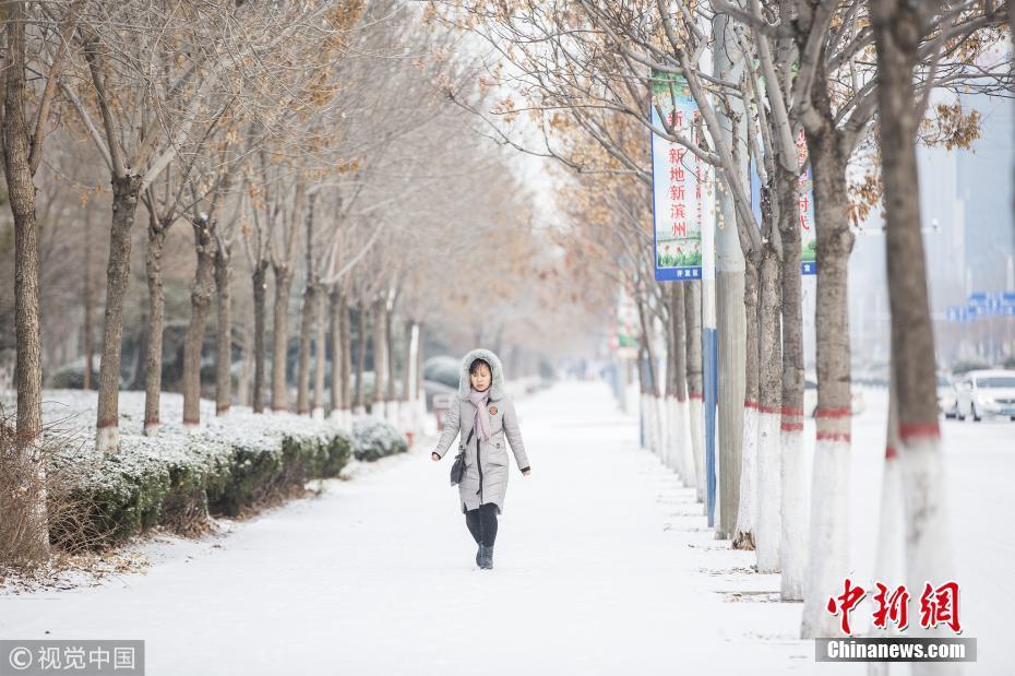 山東濱州發(fā)布道路結(jié)冰黃色預(yù)警信號(hào)市區(qū)出現(xiàn)較明顯降雪,路表溫度低于0℃。圖片來源:視覺中國