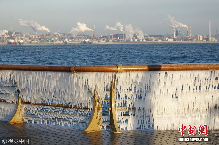 渤海海水在北風(fēng)的作用下涌向岸邊,在大連東港海岸護(hù)欄上凝結(jié)成冰凌,形成約有兩公里的冰凌奇觀。圖為大連市東港海岸護(hù)欄結(jié)滿晶瑩剔透的冰棱。圖片來(lái)源:視覺(jué)中國(guó)