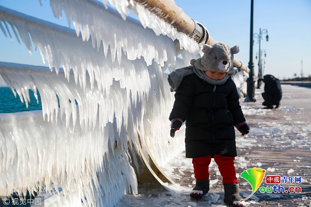 渤海大連北部海域潮水涌上岸邊,在堤壩的護(hù)欄上凝結(jié)成千姿百態(tài)的冰凌奇觀。