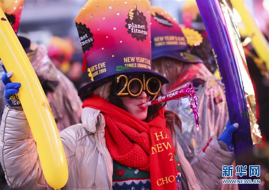 1月1日,在美國(guó)紐約時(shí)報(bào)廣場(chǎng),一名女子參加跨年活動(dòng)。 新華社記者王迎攝