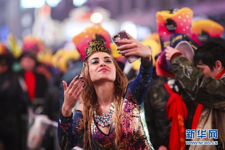 1月1日,在美國(guó)紐約時(shí)報(bào)廣場(chǎng),一名女子在新年鐘聲敲響后自拍。 新華社記者王迎攝