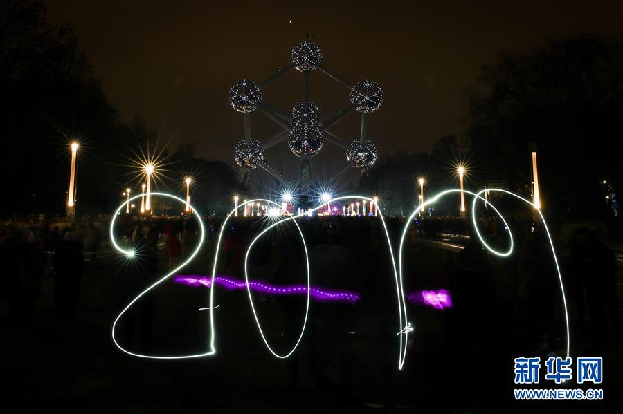 2018年12月31日,游客在比利時首都布魯塞爾的地標(biāo)性建筑——原子球塔前用光繪出2019的字樣,迎接即將到來的2019年。 新華社記者鄭煥松攝