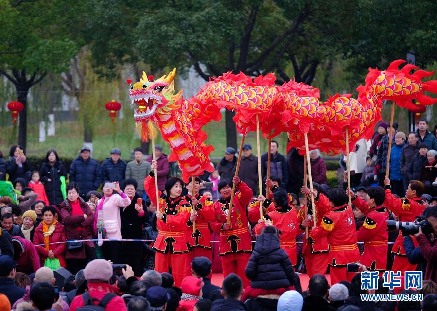 2019年1月1日,演員在展演活動(dòng)上進(jìn)行舞龍表演。2019年元旦,浙江省桐鄉(xiāng)市濮院鎮(zhèn)舉辦新年“非遺文化藝術(shù)節(jié)”活動(dòng),濮院鎮(zhèn)下屬多個(gè)鄉(xiāng)村的傳統(tǒng)美食制作、手工藝品、非遺文化表演等鄉(xiāng)村特色非遺項(xiàng)目在濮院鎮(zhèn)中心廣場(chǎng)進(jìn)行集中展示展演。新華社記者 徐昱 攝