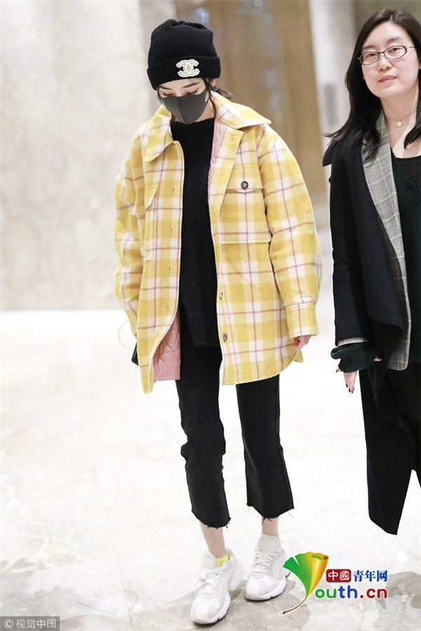 2018年1月6日,上海,楊冪現(xiàn)身某酒店。她戴著帽子口罩,身穿黑色套裝,而外面搭配的奶黃格子外套卻瞬間減齡,明亮又惹眼,無懼寒冬露著纖細腳踝,依舊是那個很會穿搭的大冪冪。