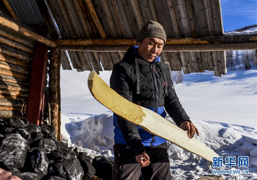 森格爾在新疆布爾津縣禾木村的一處冬季牧場(chǎng)制作毛皮滑雪板(1月3日攝)。新華社記者 胡虎虎 攝