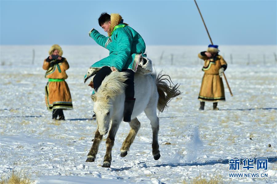 1月8日,牧民在馴服一匹烈馬。 時下正值草原冬季旅游旺季,內(nèi)蒙古自治區(qū)西烏珠穆沁旗的牧民們在雪原上一展身手,為游客展現(xiàn)獨特的民族風情。 新華社記者 鄒予 攝
