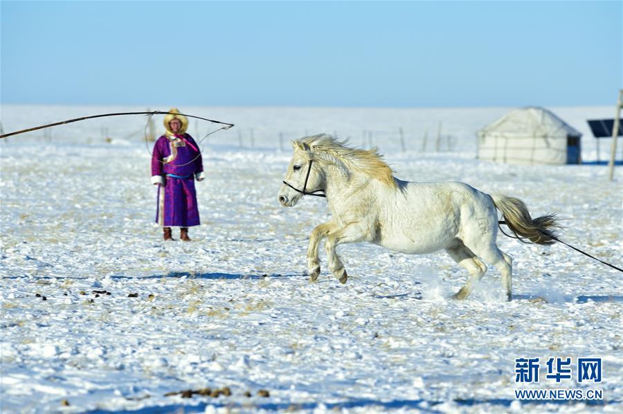 1月8日,牧民進(jìn)行套馬表演。 時下正值草原冬季旅游旺季,內(nèi)蒙古自治區(qū)西烏珠穆沁旗的牧民們在雪原上一展身手,為游客展現(xiàn)獨(dú)特的民族風(fēng)情。 新華社記者 鄒予 攝