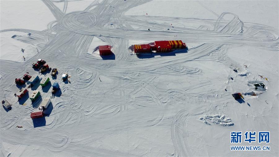 1月13日無人機(jī)拍攝的中國(guó)第35次南極科考隊(duì)昆侖隊(duì)營(yíng)地(左)、昆侖站(中)與深冰芯房。 新華社記者 劉詩(shī)平 攝