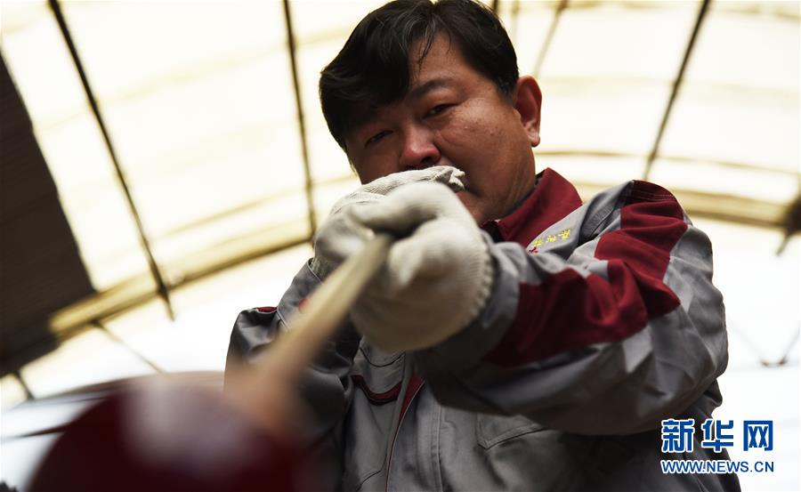 1月12日,孫云毅在吹制雞油黃琉璃藝術(shù)品。