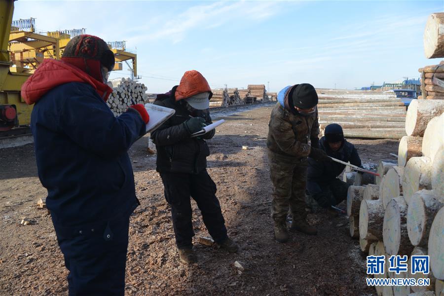1月12日,在滿洲里鐵路口岸站裝卸二車間原木換裝場(chǎng)區(qū),工作人員對(duì)進(jìn)口落地原木進(jìn)行檢尺核對(duì)工作。