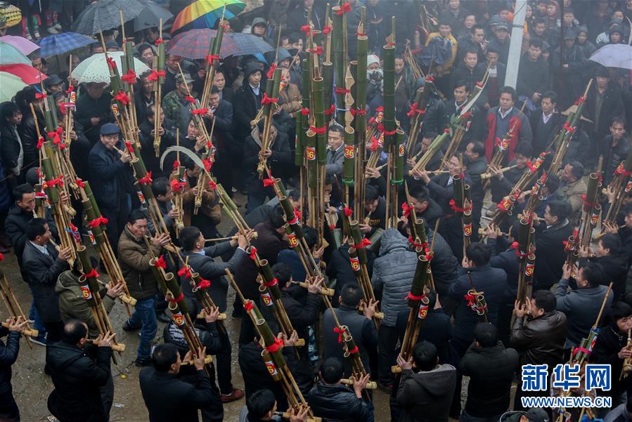 1月14日,人們在廣西融水苗族自治縣紅水鄉(xiāng)舉行的蘆笙節(jié)上賽蘆笙。