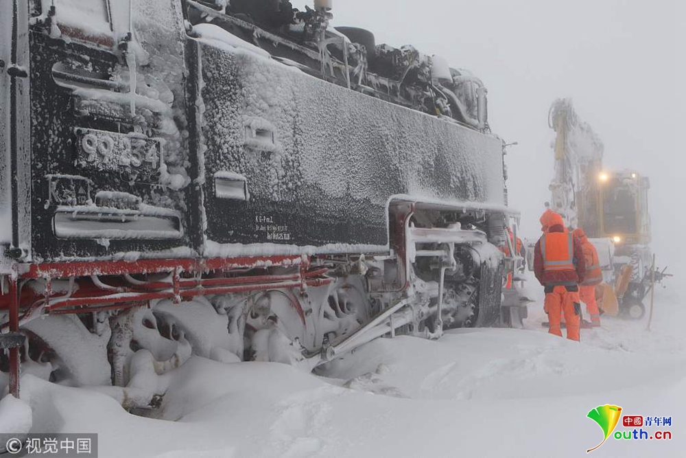 當?shù)貢r間2019年1月9日,德國錫爾克,一輛蒸汽火車被大雪困住無法前進。