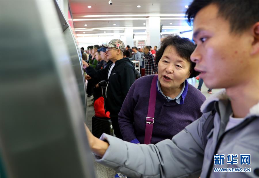 1月15日,廣東湛江青年許東濱(右)在廣州火車站售票大廳內(nèi)的自助售票終端上買完車票后,順便幫助一位老人查詢車票信息。 為適應互聯(lián)網(wǎng)購票旅客比重持續(xù)上升趨勢,廣州火車站在籌備2019年春運票務業(yè)務時,優(yōu)化互聯(lián)網(wǎng)購票取票和退改簽業(yè)務辦理流程設(shè)計,提升效率,方便旅客出行。 新華社記者劉大偉攝