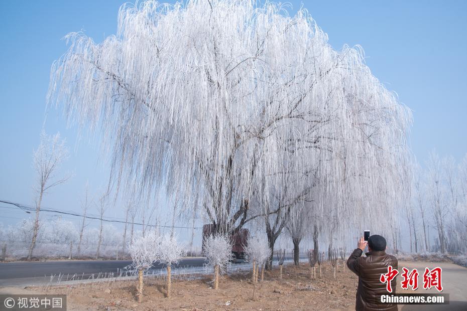 1月13日,107國道河北省定州路段出現(xiàn)霧?。鋻欤┚坝^,吸引路人駐足拍照留念。王保生 攝 圖片來源:視覺中國