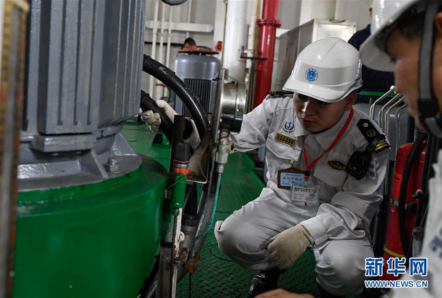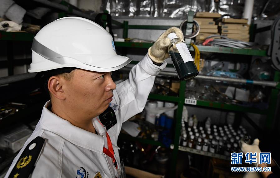 1月15日,??诤J戮止ぷ魅藛T在粵海鐵4號客滾船上檢查油樣。新華社記者 楊冠宇 攝
