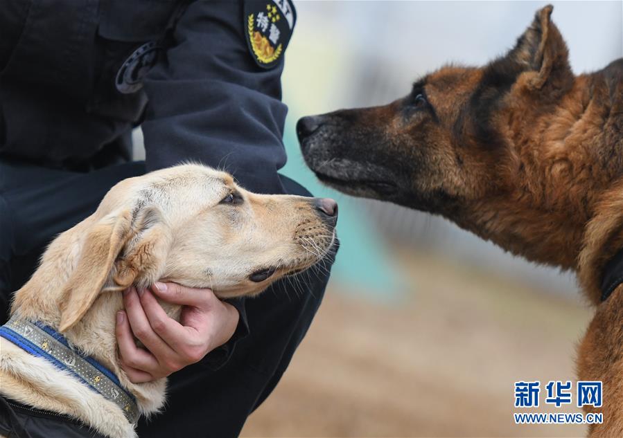 1月15日,即將組成春運(yùn)搭檔的警犬“皮特”(左)和“哼哼”在進(jìn)行崗前磨合。 新華社記者 程敏 攝
