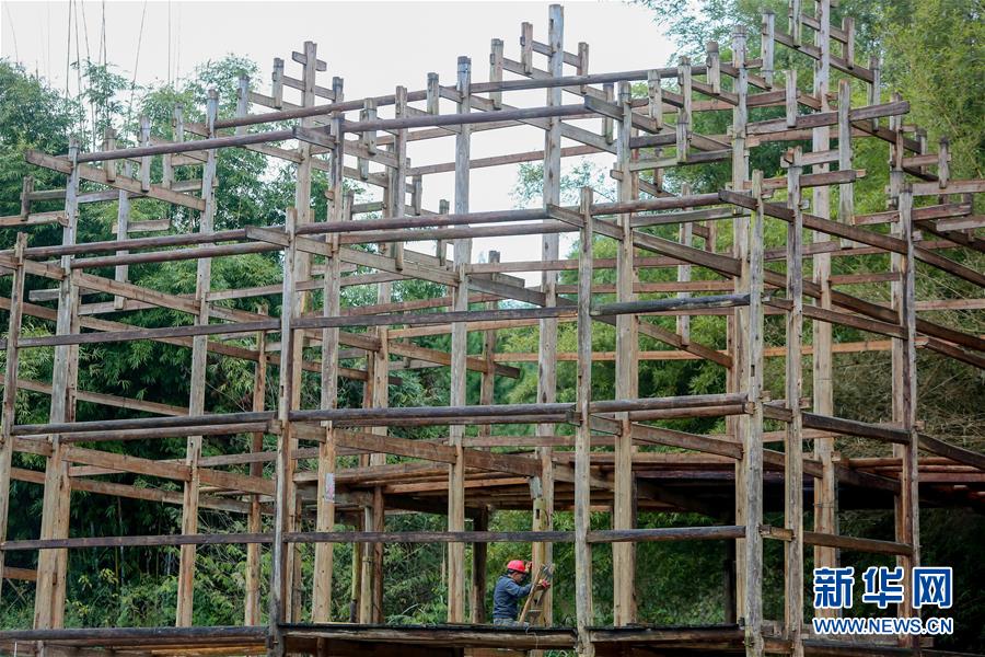 1月15日,在廣西融水苗族自治縣融水鎮(zhèn)夢(mèng)嗚苗寨,一名工人將苗族吊腳樓的主要結(jié)構(gòu)進(jìn)行“復(fù)原”安裝。新華社記者 陳君清 攝