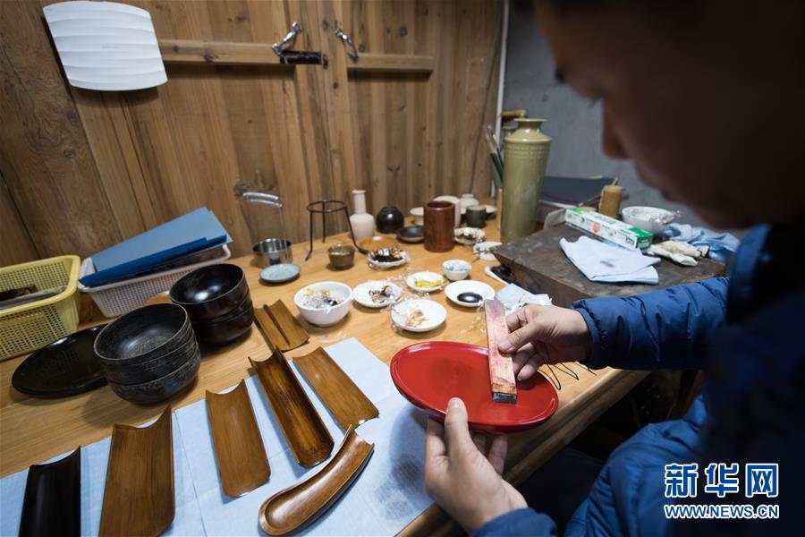 1月15日,吳榮強(qiáng)在龍泉市牛頭嶺村“七分醉”工作室制作漆器。新華社記者翁忻旸攝