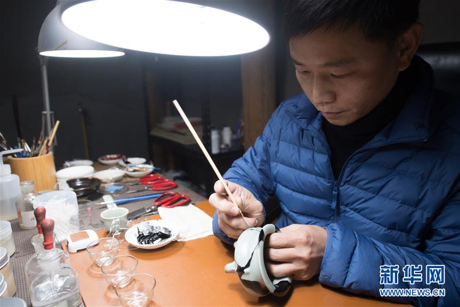 1月15日,吳榮強(qiáng)在龍泉市牛頭嶺村“七分醉”工作室對(duì)一件青瓷器皿進(jìn)行漆繕。 新華社記者翁忻旸攝