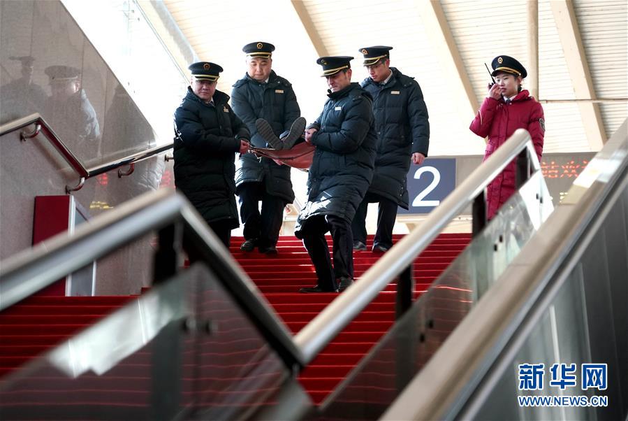 1月16日,鶴壁東站的職工在進(jìn)行列車(chē)下交重傷病旅客應(yīng)急演練。 當(dāng)日,中國(guó)鐵路鄭州局集團(tuán)有限公司新鄉(xiāng)車(chē)務(wù)段鶴壁東站組織職工開(kāi)展服務(wù)禮儀、手語(yǔ)等業(yè)務(wù)培訓(xùn),并進(jìn)行非正常情況應(yīng)急演練,為2019年春運(yùn)做準(zhǔn)備。 新華社記者李安攝