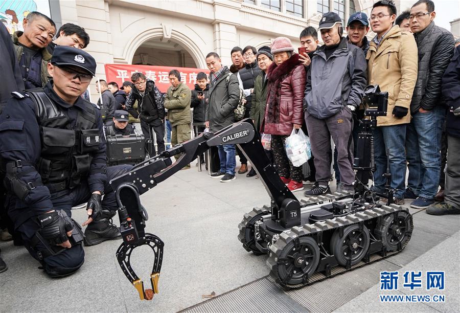 1月16日,旅客們在觀看警用排爆機器人演示。 當(dāng)日,武漢鐵路公安處在漢口火車站舉行警營開放日活動,讓旅客零距離接觸警務(wù)安全工作,營造良好的春運出行環(huán)境。 新華社記者程敏攝