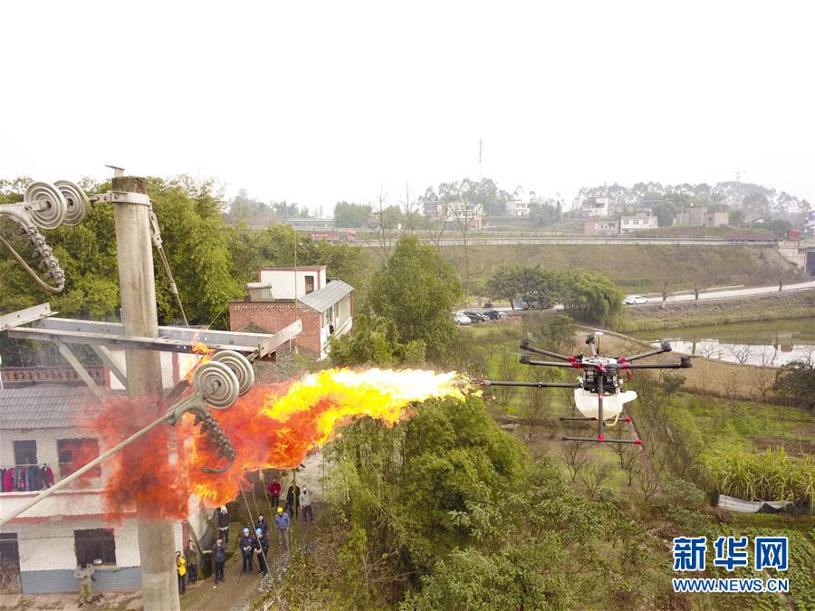 1月16日,噴火清障無人機(jī)在國(guó)網(wǎng)重慶永川供電公司無人機(jī)班兩名操作手的控制下進(jìn)行噴火清障作業(yè)演示。 1月16日,經(jīng)過3年多的研發(fā)和測(cè)試,重慶首臺(tái)噴火清障無人機(jī)在國(guó)網(wǎng)重慶永川供電公司無人機(jī)班正式投用。這臺(tái)多旋翼無人機(jī),通過搭載帶有燃料箱、油泵、自動(dòng)點(diǎn)火裝置的噴火吊艙任務(wù)模塊,可以對(duì)影響高空電力線路安全的飄掛物進(jìn)行定點(diǎn)障礙清除作業(yè)。 據(jù)噴火清障無人機(jī)研發(fā)負(fù)責(zé)人何濤介紹,過去高空清除異物主要靠人工進(jìn)行,為保證安全經(jīng)常需要停電作業(yè),因此他們結(jié)合實(shí)際工作經(jīng)驗(yàn)和高空電力線路的自身特點(diǎn),設(shè)計(jì)和制造出了噴火清障無人機(jī)。2018年測(cè)試期間,國(guó)網(wǎng)重慶永川供電公司無人機(jī)班在多種環(huán)境下成功執(zhí)行了50多次高空電力線路清障作業(yè)。 新華社記者 劉潺 攝