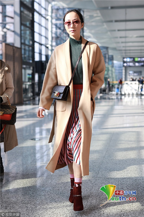 2019年1月17日,上海,韓雪現(xiàn)身機場,穿著條紋紗裙露出小腿,十分抗凍,她搭配經典的駝色大衣,氣質出眾在機場人群中相當搶鏡。