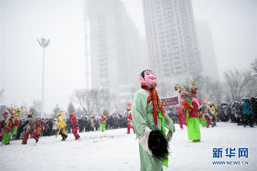 2月16日,社火隊(duì)演員在青海省大通回族土族自治縣文化廣場表演。
