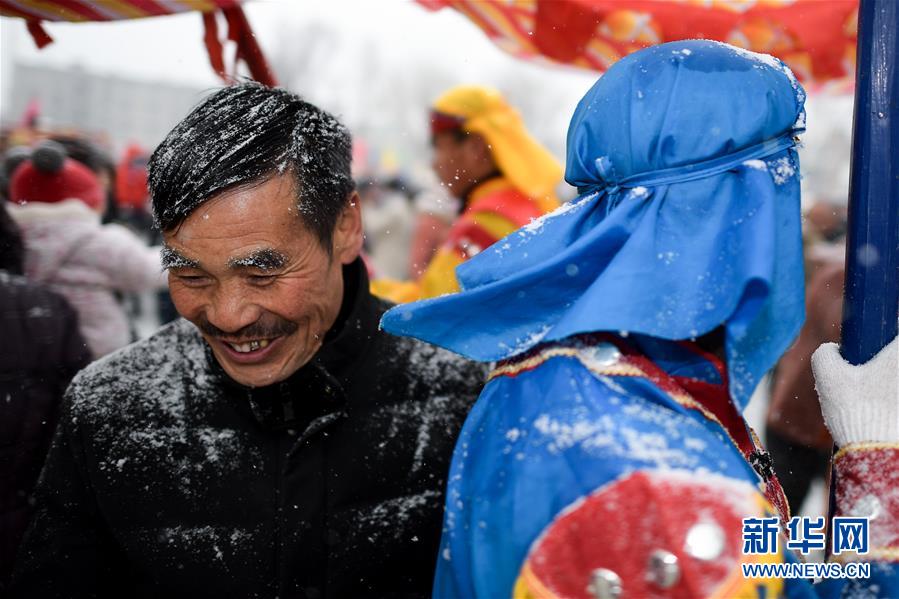 2月16日,青海省大通回族土族自治縣文化廣場,當地百姓在社火表演中“鉆龍身”。新華社記者吳剛攝