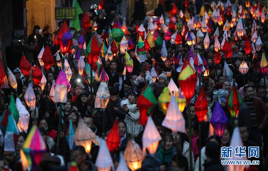 2月18日,在四川省南充市嘉陵區(qū)金寶鎮(zhèn),群眾舉著“蠐蟆燈”巡游。 當(dāng)日是農(nóng)歷正月十四,夜幕降臨后,川渝等地數(shù)萬名群眾在四川省南充市嘉陵區(qū)金寶鎮(zhèn)匯聚,點亮“蠐蟆燈”,敲著鑼鼓唱著歌謠,將“蠐蟆”送到幾公里外的田邊或者河邊燒掉,祈福健康平安。星星點點的燈光在鄉(xiāng)間小路閃爍移動,場面壯觀熱烈。 “送蠐蟆”祈福這一習(xí)俗源于清朝,歷經(jīng)演變成為川東北地區(qū)一個古老而神秘的地方民俗節(jié)日。 新華社記者 江宏景 攝