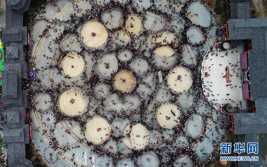2月24日,在貴州省凱里市舟溪鎮(zhèn),苗族群眾在跳蘆笙舞(無人機拍攝)。 當日,在貴州省黔東南苗族侗族自治州凱里市舟溪鎮(zhèn),來自各地的苗族群眾身著節(jié)日盛裝,歡聚在古老的“甘囊香”蘆笙堂,男子吹奏起蘆笙,姑娘和孩子們跳起蘆笙舞,歡度新春,祈求風調雨順、五谷豐登,青年男女也借此良日尋覓意中人。 “甘囊香”是苗語音譯,意思為“河流的下游,神仙匯聚的地方”。“甘囊香”蘆笙會是貴州規(guī)模最大、最古樸的苗族蘆笙會之一。 新華社記者楊文斌攝