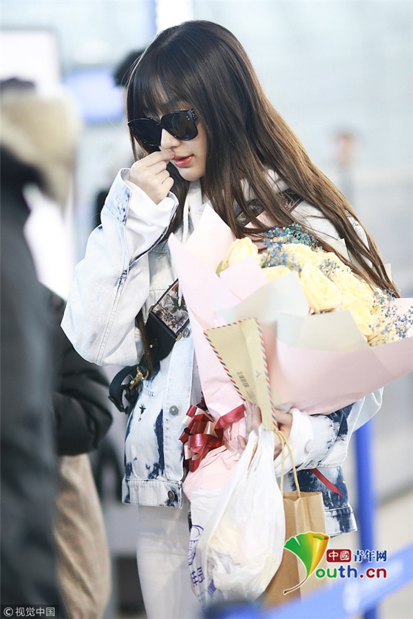 2019年2月24日,上海,楊穎現身機場。她全白套裝現身身材十分纖細,手捧粉絲送的花與小粉絲合影,十分親切。