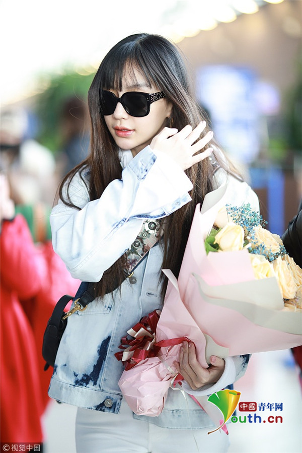 2019年2月24日,上海,楊穎現(xiàn)身機場。她全白套裝現(xiàn)身身材十分纖細(xì),手捧粉絲送的花與小粉絲合影,十分親切。