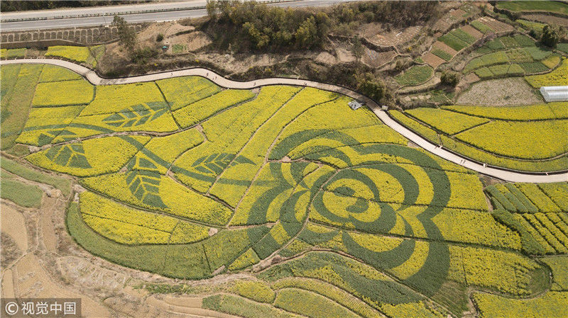2019年近日,在云南省安寧市山口村,油菜花田里“長(zhǎng)出”一朵巨大的“山茶花”,吸引游客到此觀賞拍照。圖為3月1日,航拍油菜花田中的山茶花圖案。劉冉陽(云南分社)/中新社/視覺中國(guó)
