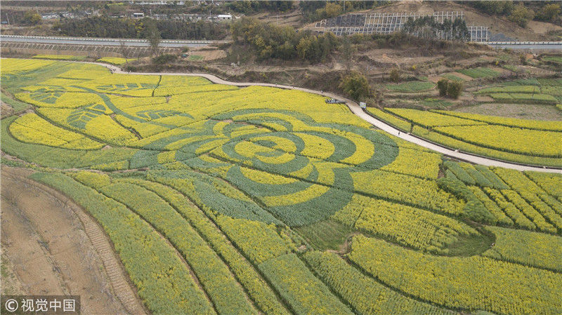 2019年近日,在云南省安寧市山口村,油菜花田里“長(zhǎng)出”一朵巨大的“山茶花”,吸引游客到此觀賞拍照。圖為3月1日,航拍油菜花田中的山茶花圖案。劉冉陽(云南分社)/中新社/視覺中國(guó)