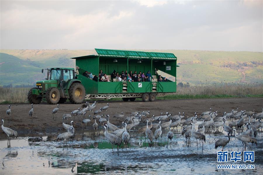 3月7日,在以色列阿格蒙胡拉鳥類和自然公園,游客乘坐拖拉機(jī)牽引的觀光車觀鳥。位于以色列北端的胡拉谷地冬季氣候相對溫暖濕潤,食物來源充足,是候鳥在歐洲和非洲之間遷徙的重要中轉(zhuǎn)站。20世紀(jì)90年代,當(dāng)?shù)剞r(nóng)民、以色列農(nóng)業(yè)部和自然保護(hù)組織共同設(shè)立阿格蒙胡拉鳥類和自然公園,在指定的地點給候鳥喂食,既能保護(hù)周邊農(nóng)田的莊稼不被候鳥啄食,又能為遷徙的候鳥補(bǔ)充之后旅程所需的能量,成為候鳥“加油站”。新華社記者郭昱攝