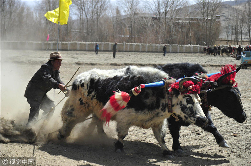 圖為白朗縣洛江鎮(zhèn)農(nóng)牧民進(jìn)行“賽?!被顒樱灰r(nóng)牧民不從犁上掉下來,便可以獲得一把象征著勞動致富的鐵鍬。