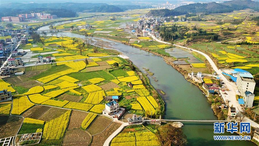 3月20日在貴州錦屏縣新化鄉(xiāng)拍攝的春景(無人機拍攝)。春分將至,貴州各地成片的油菜花漸次綻放,如同金色的地毯鋪上云貴高原。 新華社記者 歐東衢 攝